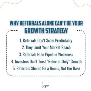 When pitching investors, saying your pipeline is “mostly referrals” makes your business look fragile. Investors fund repeatable engines, not networks of goodwill.